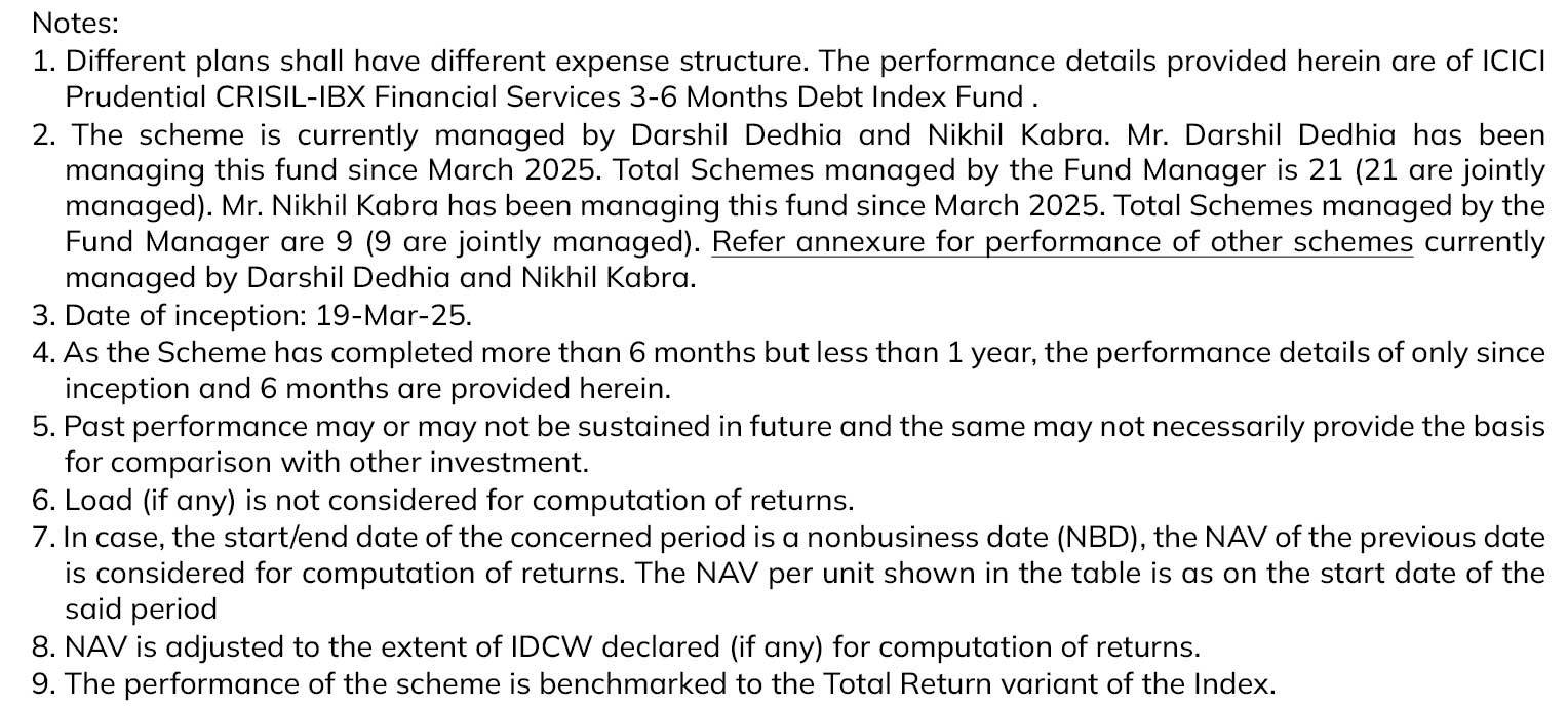 ICICI Prudential CRISIL-IBX Financial Services 3-6 Months Debt Index Fund (An open-ended target duration Index Fund investing in the constituents of CRISIL-IBX Financial Services 3-6 Months Debt Index. A relatively low interest rate risk and relatively low credit risk)