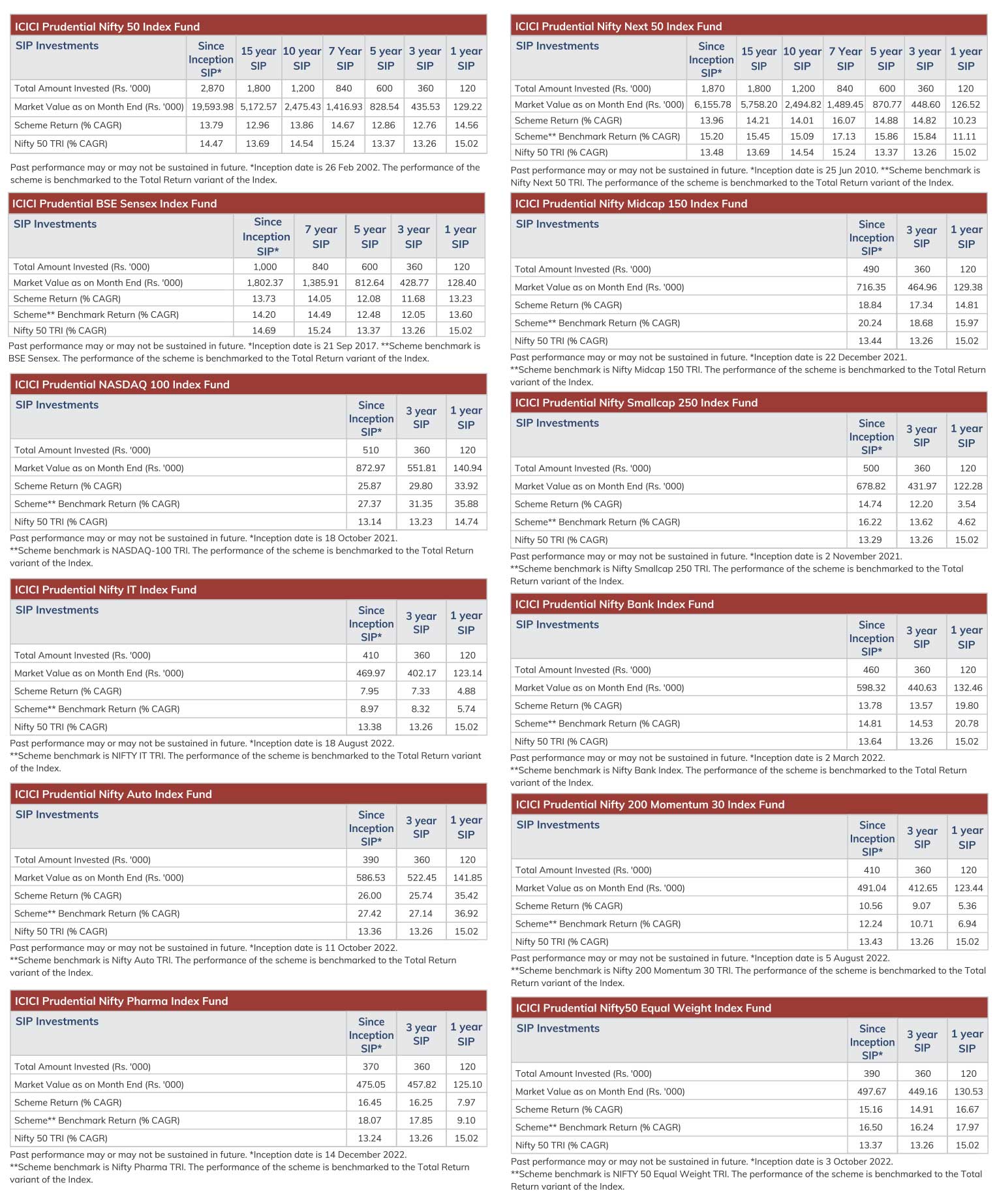 ICICI Prudential Nifty 50 Index Fund ICICI Prudential Nifty Next 50 Index Fund ICICI Prudential BSE Sensex Index Fund ICICI Prudential Nifty Smallcap 250 Index Fund ICICI Prudential Nifty Midcap 150 Index Fund ICICI Prudential Nifty LargeMidcap 250 Index Fund ICICI Prudential Nifty 500 Index FundDebt Index Funds